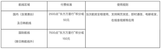 2021年9月,东方航空也推出积分或现金购买上网的套餐,乘客可以支付2500积分或50元现金购买上网服务。与南航相比,东航的上网服务能支持更大流量的应用和网页,包括视频、游戏。