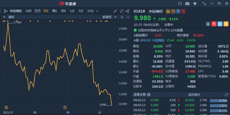 7月以来,中远海控A股累计跌30%,中远海控H股距离7月股价高点回撤幅度已达37%,今日(10月15日)港股开盘后中远海控跌超9%。