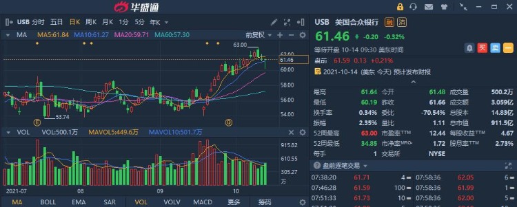 - 财报显示,美国合众银行第三季度营收58.9亿美元,市场预期57.65亿美元;净利润20.28亿美元,市场预期17.08亿美元;每股盈利1.3美元,市场预期1.15美元,均超出市场预期。