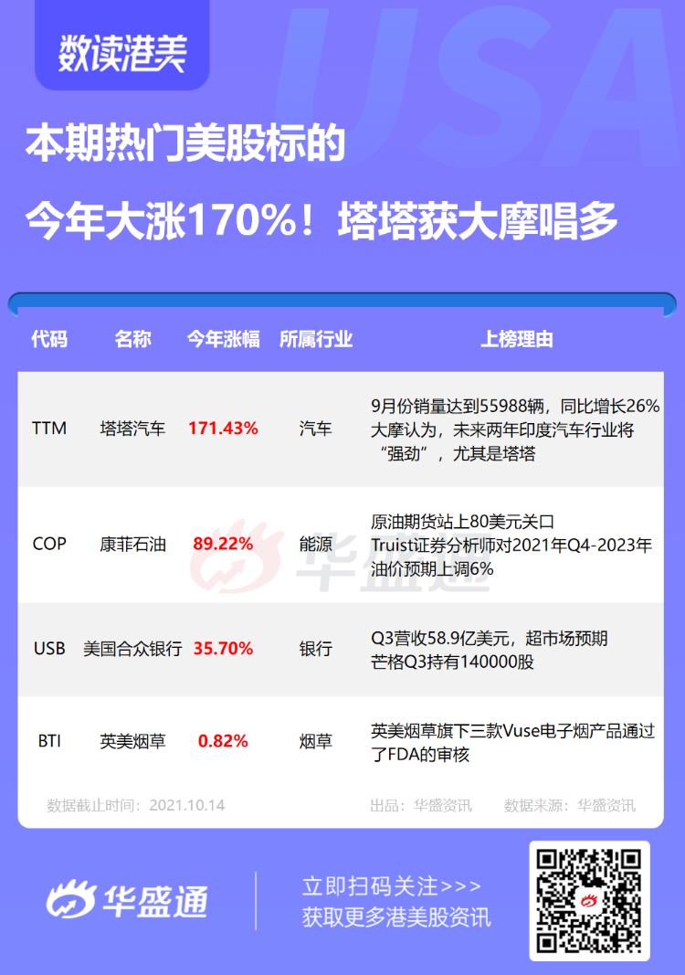 美股风向标 | 年内大涨170%!路虎母公司塔塔汽车获大摩唱多