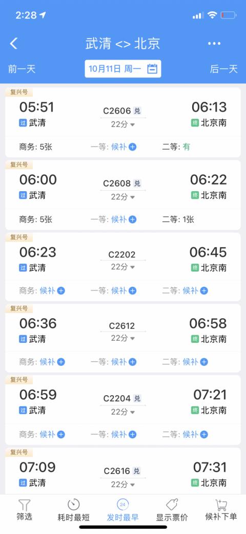 早晨从武清站出发,22分钟抵达北京南站。最早一班车5:51始发,6:13就到达了北京南站。对于9点到10点上班的工作人群来说,乘坐7点多的城际铁路绰绰有余,可以实现双城生活中的“潮汐模式”,早出晚归。