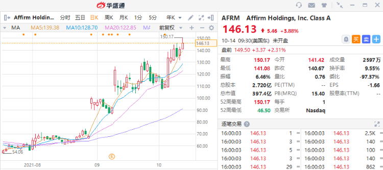 “美版花呗”Affirm自今年1月29日上市以来持续走高,上市以来涨幅累计已达198.22%,截至本周三收盘,该股最新股价报146.13美元,市值接近400亿美元。今日美股盘前,该股继续走高。截至北京时间19:49,该股涨幅达2.3%。