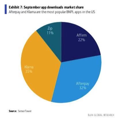 美银在报告中表示,随着越来越多的机构加入,“先买后付”赛道会变得越来越拥挤。截至2021年9月,应用软件Klarna和Afterpay仍然是美国最受欢迎的“先买后付”应用平台。Affirm暂时排名第三,但近期频频与亚马逊、苹果以及塔吉特等公司达成合作,预计会逐步获得更多的市场份额,“至少未来几年”实现30%的增长。