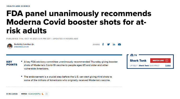 当地时间10月14日,美国食品和药品监督管理局(FDA)疫苗和相关生物制品咨询委员会 (VRBPAC)以19票同意、0票反对的投票结果,建议FDA授权向美国所有65岁以上人群,以及18至64岁的高风险人群使用莫德纳新冠疫苗加强针。