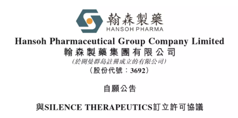 Silence Therapeutics将从翰森制药获得1600万美元的预付款,并在达到额外的开发、监管和商业里程碑后有资格获得高达13亿美元。Silence Therapeutics也将获得翰森制药产品净销售额约10%到15%区间的特许权使用费。