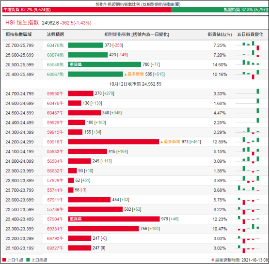 恒指牛证周二录得约1.06亿港元资金净流入部署,近5日累计约8,244万港元资金净流出套现;恒指熊证当日录得约1.16亿港元资金净流出套现,近5日累计约1.76亿港元资金净流入。