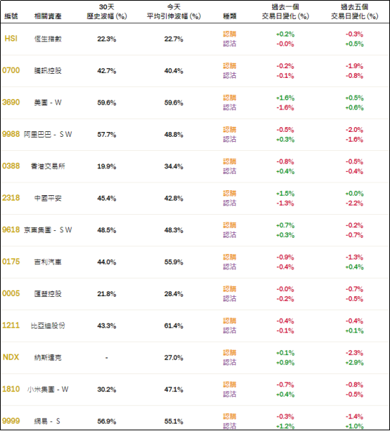 周二恒指相关权证的平均引伸波幅约22.7%,按日略有上调。个股方面,腾讯、吉利、汇丰及比迪等的相关认购证及认沽证的引申波幅均按日均有所调降;相反,纳斯达克、京东等的相关认购证及认沽证的引申波幅则按日均有所调升。