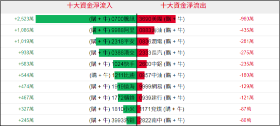 好仓(认购证及牛证)方面,周二腾讯相关好仓单日录得约2,523万港元资金净流入,阿里、平安相关好仓亦录得超1,000万港元资金净流入;相反,美团相关好仓单日录得约960万港元资金净流出,海油、润电等相关好仓单日亦录得部分资金净流出。