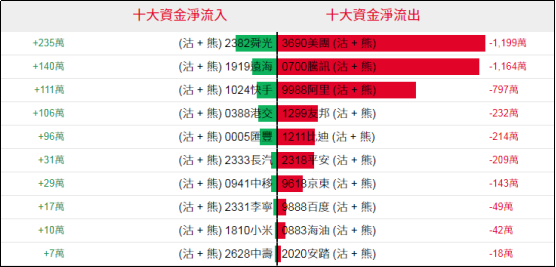 淡仓(认沽证及熊证)方面,周二个股相关淡仓净流入资金则普遍规模较小;相反,美团、腾讯相关淡仓单日分别录得约1,199万、1,164万港元资金净流出,阿里、友邦、比迪等相关淡仓亦录得部分港元资金净流出。