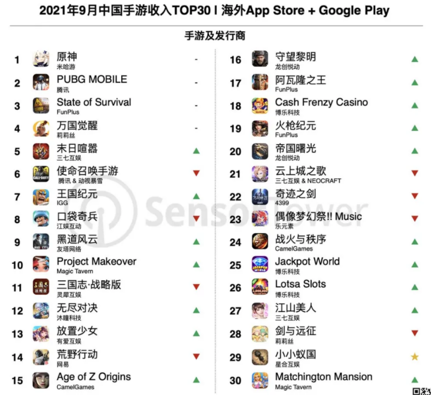 9月出海手游收入榜前10依次是:《原神》、《PUBG Mobile》、《State of Survival》、《万国觉醒》、《Puzzle & Survival》、《使命召唤手游》、《王国纪元》、《口袋奇兵》、《黑道风云》、《Project Makeover》。