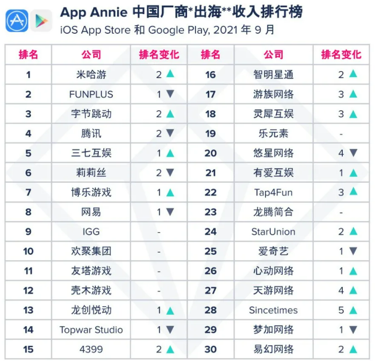 日前,Sensor Tower和APP Annie分别发布了2021年9月中国出海手游收入榜与出海厂商收入榜,为我们带来最新的海外市场趋势。