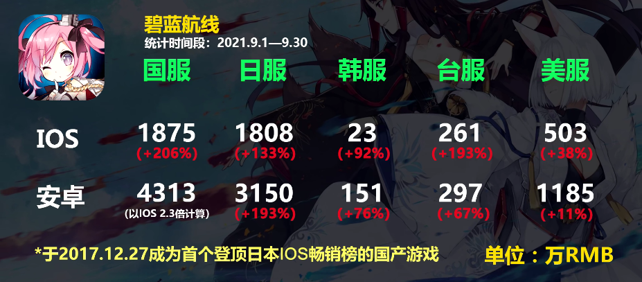据“国产二次元手游观察”等第三方估算的流水,本期增收榜排名第3的《碧蓝航线》海外营收大约为1100万美元,比8月增长了约580万美元。这个数字具有一定的参考性,因为根据该游戏未进入9月出海畅销榜Top 30(门槛1300万美元),同时又获得增收榜第3的情况,两相比对之下数据都较为符合。