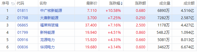 华盛资讯10月15日消息,绿电股午后持续上涨,截至发稿,中广核新能源涨超10%;大唐新能源、福莱特玻璃涨超7%;新特能源、龙源电力涨超4%;华润电力涨超3%。