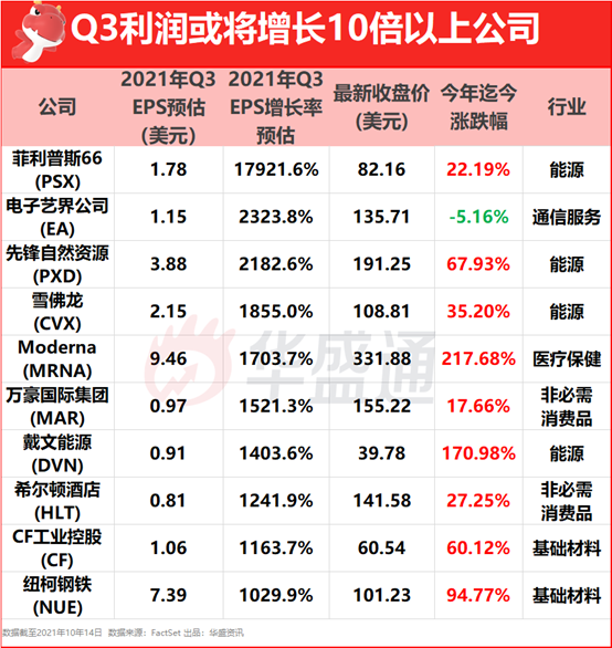 在对标准普尔全球市场情报(S&P Global Market Intelligence)和MarketSmith的数据进行了分析之后,FactSet的收益分析师John Butters说,标普500指数成份股公司第三季度的收益预计将跃升27.6%,而其中的10家公司,本季度经调整后的每股盈利(EPS)或将增长超过1000%。