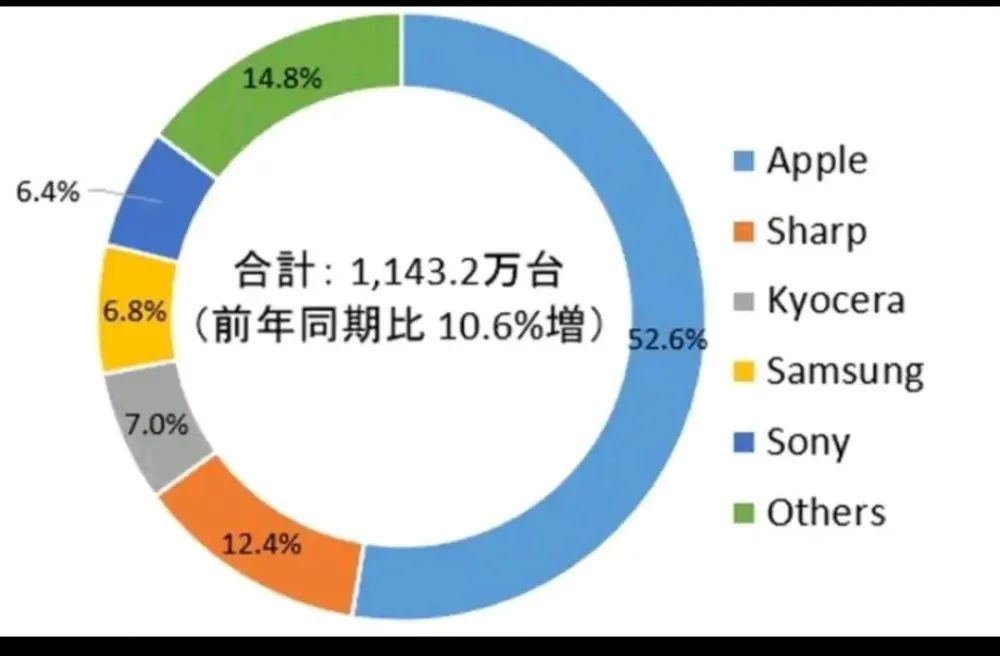 所以在2020年第四季度日本市场手机总出货量苹果占据了超过50%,但在其它地区籍籍无名的夏普和京瓷市场份额加起来差不多还有20%的份额。2020年第三季度日本智能手机市场出货量报告显示,日本的智能手机出货量为658.7万台,其中苹果占比43.7%,剩下的基本全是日本本土手机,夏普、京瓷、索尼三家瓜分天下。
