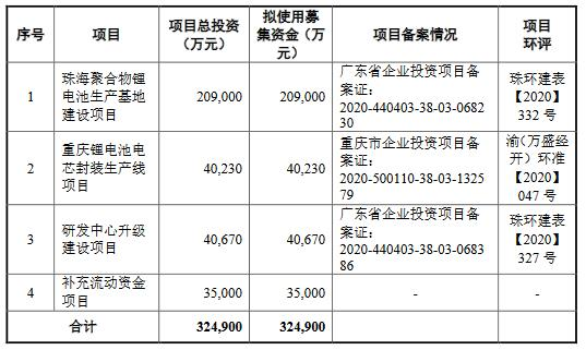 珠海冠宇最终募集资金净额比原计划少11.45亿元。珠海冠宇于10月11日披露的招股书显示,公司拟募集资金32.49亿元,分别用于珠海聚合物锂电池生产基地建设项目、重庆锂电池电芯封装生产线项目、研发中心升级建设项目、补充流动资金项目。