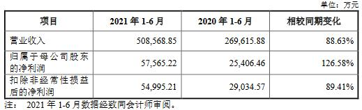 招股说明书显示,2021年1-6月,珠海冠宇营业收入为50.86亿元,同比增长88.63%;归属于母公司所有者的净利润为5.76亿元,同比增长126.58%;扣除非经常性损益后归属于母公司所有者的净利润为5.50亿元,同比增长89.41%。