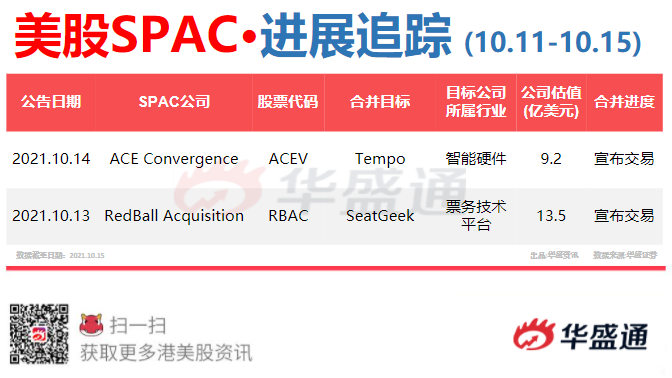 交易方面,本周SPAC市场新增两宗交易,智能硬件公司Tempo Automation将通过与SPAC公司ACE Convergence Acquisition $ACEV 合并上市,预计合并将于2022年第一季度完成;票务技术平台SeatGeek计划将与RedBall Acquisition Corp $RBAC 进行业务合并公开上市。