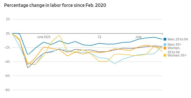 疫情在当下也仍然是就业参与率迟迟难以复苏的一个关键障碍。根据穆迪(Moody 's)对美国商务部数据的分析,6月中旬至9月中旬期间,因感染新冠病毒或照顾感染病毒的病人而无法参加工作的人数增加了250万人。