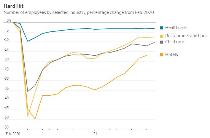 疫情下的边境封锁也减少了移民劳动力的进入。许多婴儿潮一代对疫情的恐惧以及他们在牛市中积累的投资收入,令他们毅然选择提前退休,其他一些人则成为了个体经营者。数万亿的联邦救济资金也使得许多人不再那么渴望回到艰苦的、收入微薄的工作岗位中。