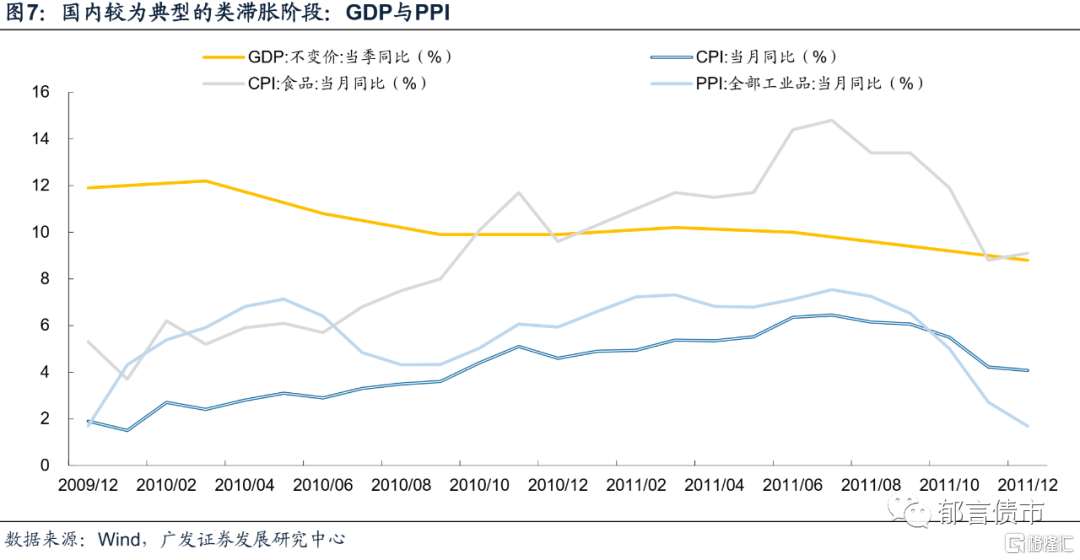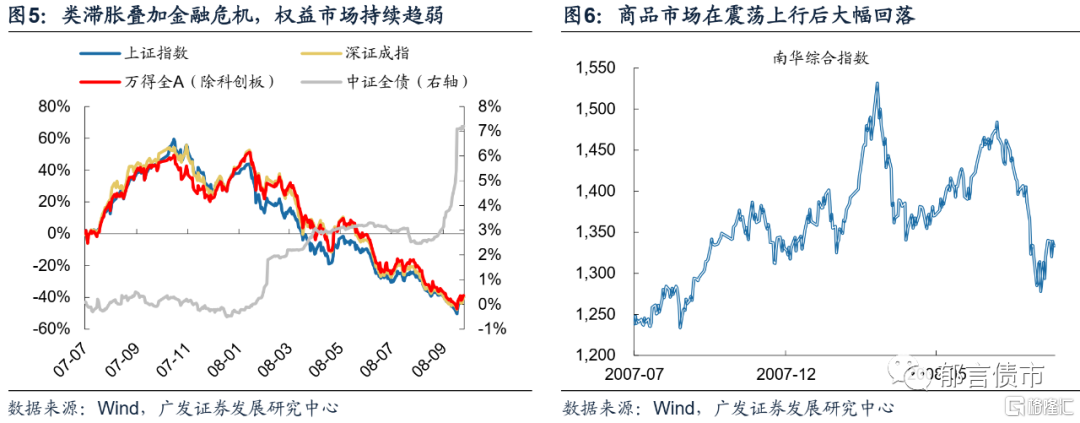 回顾这一段周期的特征,我们可以发现始于2007和2010年的两轮类滞胀期存在很多相似性。从经济来看,同样始于经济增速和价格水平同步上升带来的经济过热,随后在紧缩的货币政策周期中经济增长率先下行,但通胀水平仍然延续高位,带来持续的类滞胀环境。回顾同期的资产价格走势,在这两轮周期中,经济增长数据对资产价格的指向性有限,反而是通胀水平趋高,以及随之而来的货币政策转向对股债和商品价格带来了更显著的影响。两轮类滞胀中,利率中枢均在前期通胀压力和货币紧缩中趋高,随后在通胀压力趋缓,经济环境逐渐由类滞胀转换为类衰退后,才转为下行。