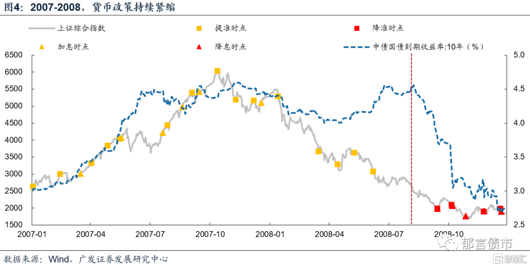 进入2008年后,央行延续了提高准备金的步伐,先后于1月、4月、5月分别提高准备金率0.5个百分点,并于6月宣布提高准备金率1个百分点,致使回购利率大幅上行。受通胀预期和流动性收紧环境影响,10年期国债收益率中枢在2007年6月加速上行至4.5%左右,随后在4.0-4.5%的范围内震荡,权益市场熊市也在货币紧缩中继续延续。