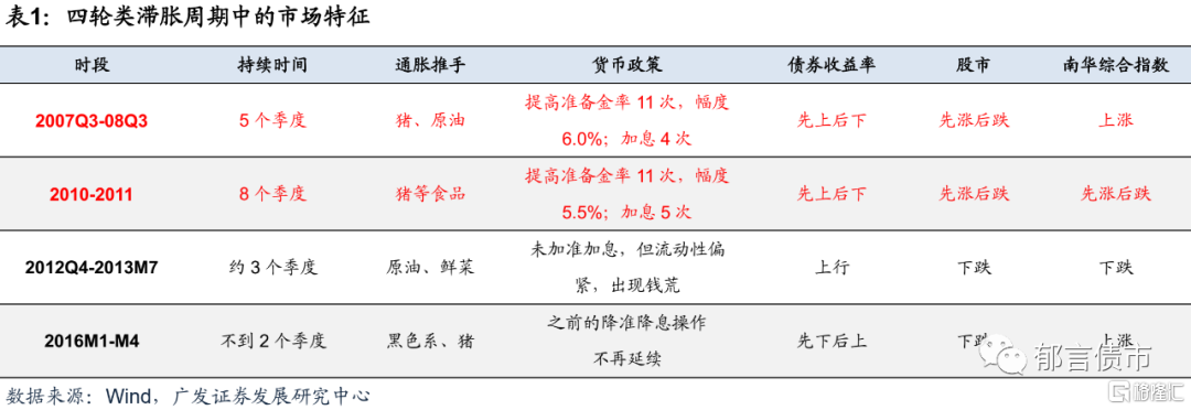 本轮类滞胀预期形成的原因,与前两轮并不相同,资产价格走势也不会简单重演。不过,过去两轮资产价格的变化过程仍有一定参考意义。在这两个时段,利率的走势呈现先上行,中间震荡,最后快速下行的过程。最初由货币政策收紧带来利率快速上行,中间是一段对各种利空(继续加息和提高准备金率)反应钝化的过程,最后是价格拐头下降,通胀因素消退之后,利率快速下行。