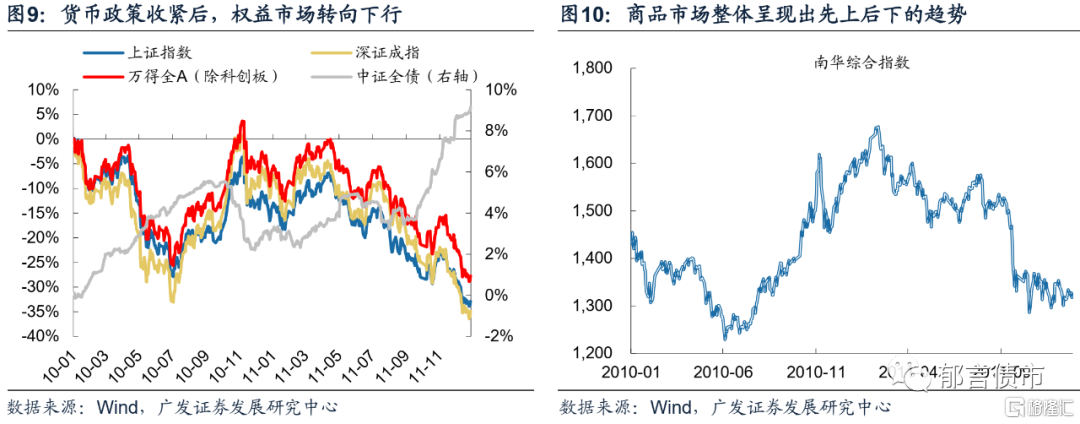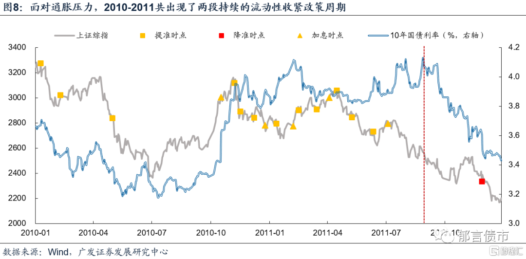 面对通胀压力,这一阶段共出现了两段持续的流动性收紧政策周期。其中第一次发生在2010年上半年,2010年1月18日,央行宣布上调准备金率0.5个百分点,标志着2009年以来极度宽松的货币政策的终结,并随后在同年2月和5月分别再次提升了法定准备金率。