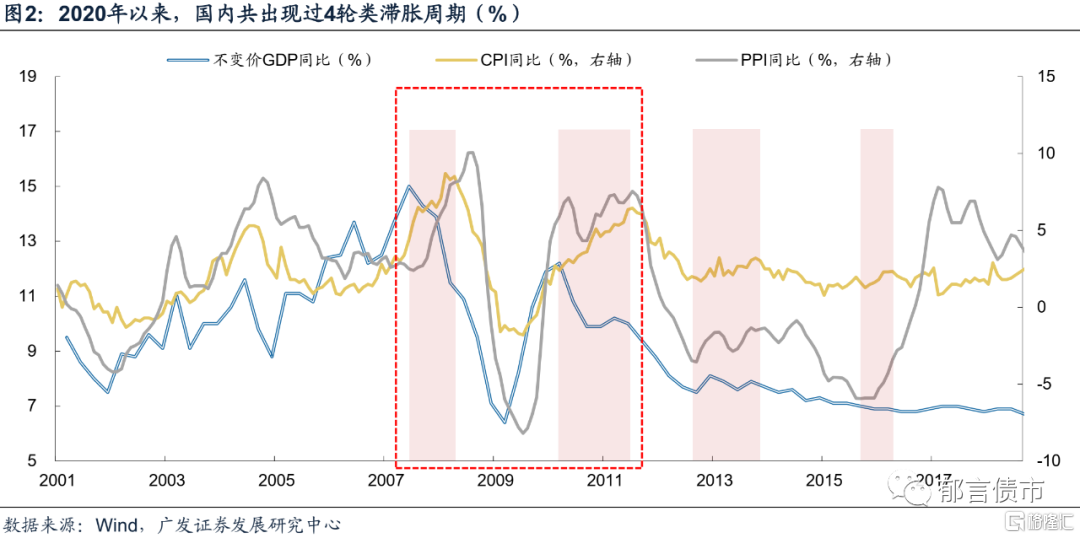 样本观测期内第一段类滞胀出现在2007年三季度至2008年三季度,持续时间约为5个季度。这一阶段,在全球金融危机的大背景下,国内经济增速大幅下行,叠加猪肉和原油推动价格水平持续上行,国内经济呈现出典型的类滞胀特征。同时,货币政策的大幅收紧也成为了这一阶段影响资产价格走势的重要因素。