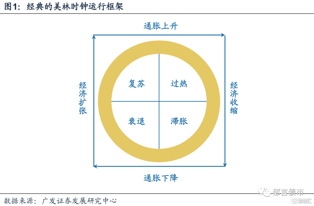 从严格的定义来看,狭义的滞胀环境其实很难出现。从美林时钟的经典框架来看,滞胀是经济运行四阶段循环(复苏-过热-滞胀-衰退-复苏······,如此往复)中的一个,代表经济停滞+通胀上行的市场环境。在该框架中,滞胀常发生在经济由过热阶段转向衰退的过程中。随着上一阶段经济逐渐由复苏转向过热,通胀水平会随着经济增速一同升高。此时,为了防止价格水平进一步上行,央行倾向于采取紧缩的货币政策,并同时引发经济降温。然而由于经济增长和价格存在时滞,此时的通胀水平尚未回落,从而形成通胀上行+经济增长疲弱的滞胀环境。