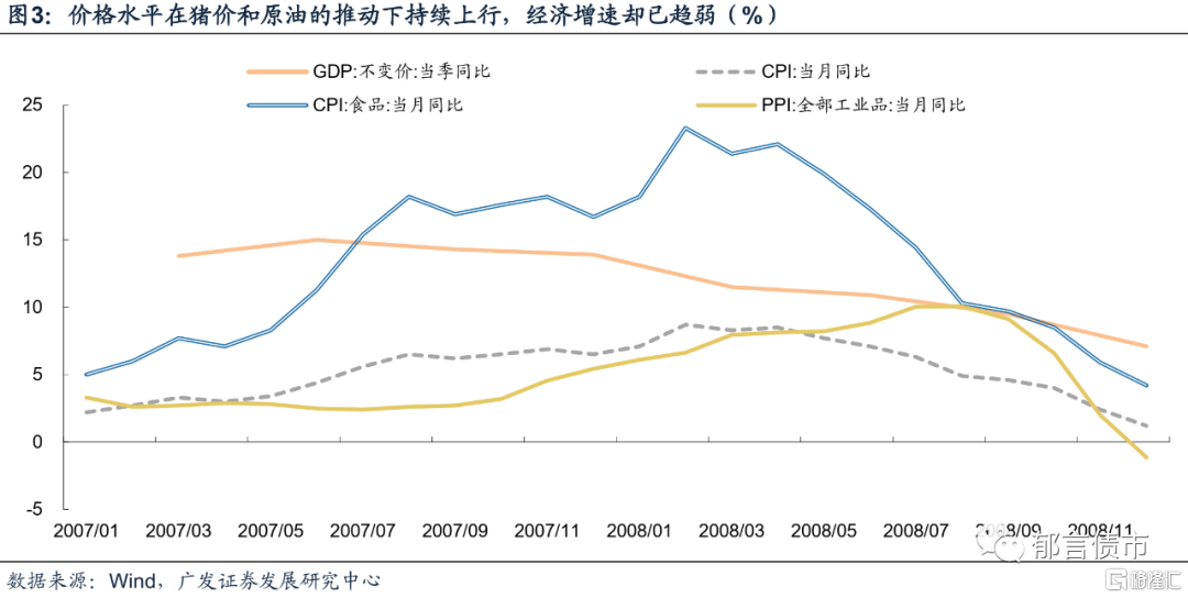 2007年4月起,生猪价格在短暂的回落后重回上升区间,并出现持续上涨。5月全国36个大中城市精瘦肉价格环比增速已超过10%。随后在6月6日,时任央行行长周小川在英国《银行家》杂志主办的2007年“中国银行业百强排行榜”论坛上表示,“央行密切关注最近猪肉、鸡蛋等食品价格的上涨” ,随后CPI的上行趋势逐渐成为了债市关注的焦点问题。随着金融危机持续演化,美元指数持续走弱,同时原油价格大幅上涨,对国内经济造成了明显的输入性通胀,PPI同比增速也随之持续上行。