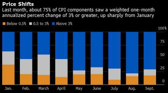 该行研究人员发现,近几个月来,价格篮子的44个主要类别中约四分之三上涨超过3%,今年年初时还不到三分之一。