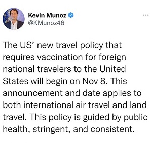 “美国新的旅行政策要求前往美国的外国游客接种疫苗,该政策将于 11 月 8 日开始实施。”白宫助理新闻秘书穆尼奥斯(Kevin Munoz)在社交媒体上发文表示,“此公告和日期适用于国际航班和通过水陆口岸入境的旅客,该政策以公共卫生为指导,严格且一致。”