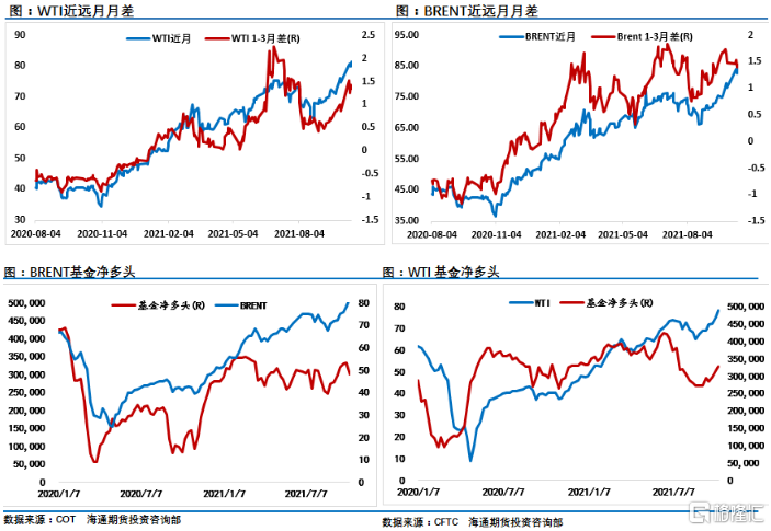 因为能源危机炒作不断升温,这也吸引了资金9月以后开始不断加速增持原油多头头寸。不过,在过去一周不同市场间投资者呈现出预期差异,截至10月12日当周,投机者所持NYMEX WTI原油净多头头寸增加10448手合约,至326605手合约,而同期布伦特原油期货投机性净多头头寸减少31756手合约至300921手合约。这种投机多头变化的差异性在油价波动上也非常明显,虽然油价整体继续上涨,但过去一周WTI油价整体表现明显强于布伦特市场,这也符合资金在两个不同市场之间的增减变化。另外,我们从WTI原油和布伦特原油月差变化能看出来这种变化,显然,相对更贴近实货市场的布伦特月差小幅回落,显示实货市场对价格相对比较克制,尤其是包括沙特、伊拉克等国为了争夺市场份额有针对性地调低升贴水动作并保证供应,以争取更多客户,这也压低了布伦特表现,但从宏观层面和能源危机角度的华尔街对冲基金显然更加乐观,近期买入原油动作更加明显,这也让WTI原油最近一周表现明显强于布伦特表现。
