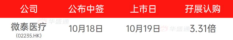 微泰医疗孖展认购3.31倍,预计将于下周一(10.18)公布中签结果,次日挂牌上市。