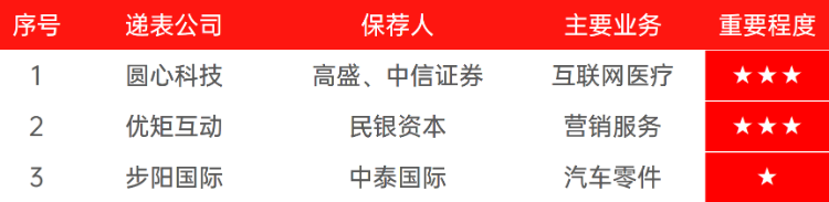 上周共有 3 家公司递交上市申请: