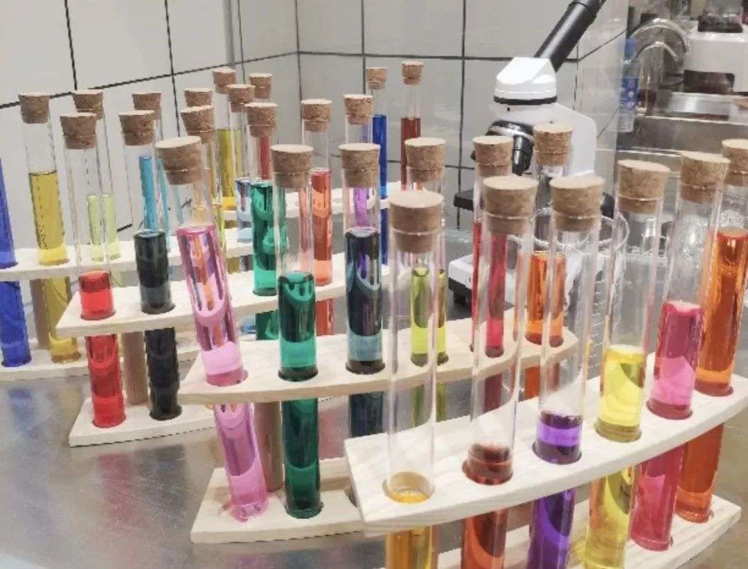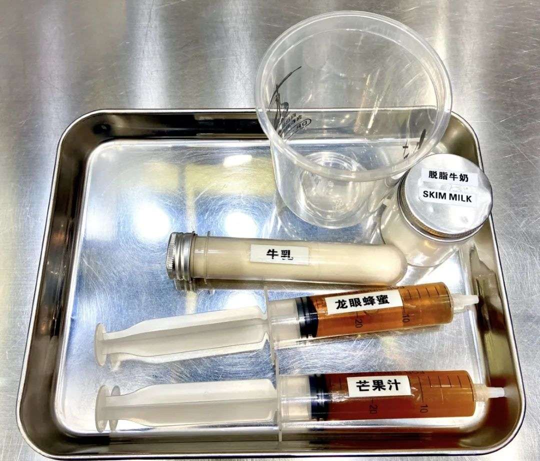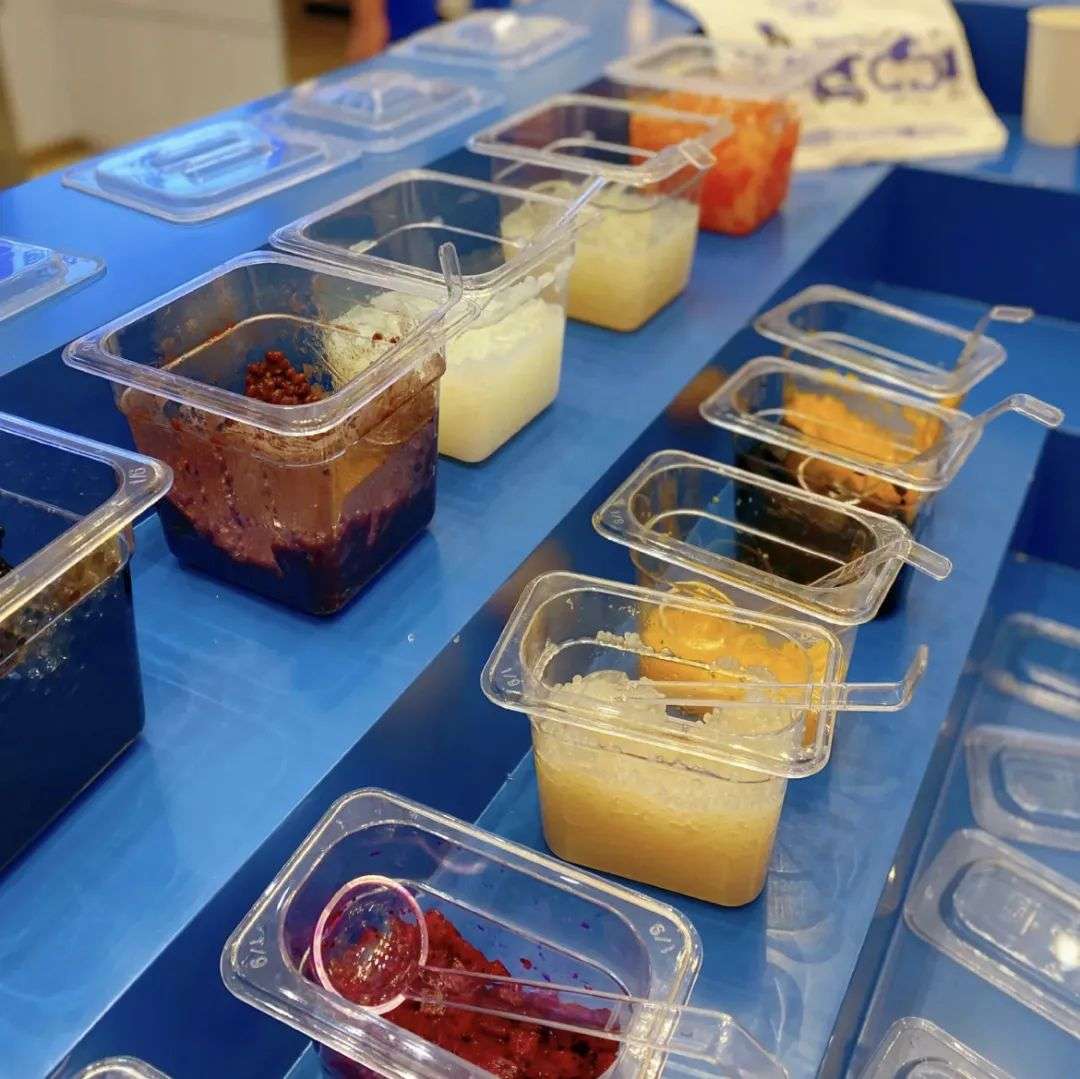 这家店的特色是, 小料使用透明容器,等量、规律摆放,奶粉使用试管密封储存,各式糖浆使用针管盛放,仪式感十足。