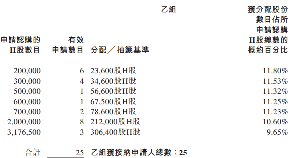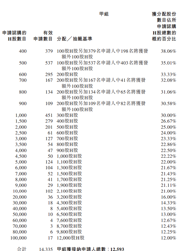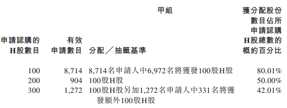 根据香港公开发售项下初步提呈发售的香港发售股份已获小幅超额认购。 合共接获14,360份根据香港公开发售通过网上白表服务及向香港结算发出电子认购指示提出的有效申请,认购合共43,116,600股香港发售股份,相当 于根据香港公开发售初步可供认购的H股总数6,353,000股的约6.79倍。