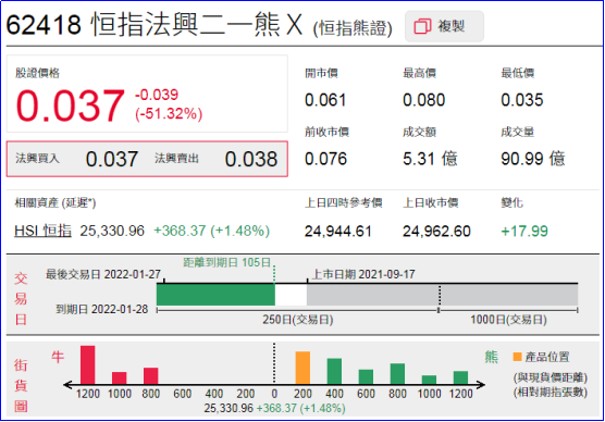 2、看错方向:恒指法兴二一熊(62418.HK),上周五大跌51.32%。