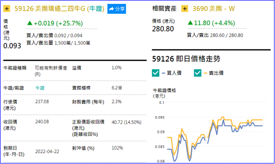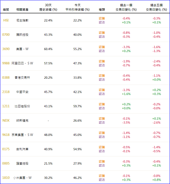 上周五恒指相关权证的平均引伸波幅报约22.2%,按日变动不大。个股方面,美团、阿里巴巴、中国平安、京东集团等相关认购证的引伸波幅按日均有所下降;美团、平安、汇丰、小米相关认沽证的引伸波幅则按日有所上调。