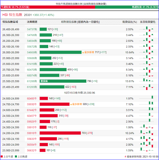 街货分布方面,至上周五,恒指牛证街货在收回价24200点至24900点之间,累计相当约2208张期指合约;恒指熊证街货在收回价25400点至26100点之间,相当约3156张期指合约。