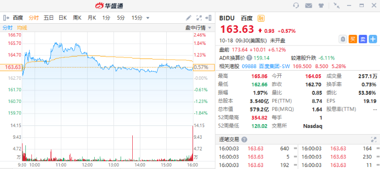 热门中概股方面,百度(BIDU)美股盘前一度涨超6%,报173.64美元。截至发稿,该股涨5.12%;今日港股尾盘时段,百度急剧拉升。高途(GOTU)一度涨2%。