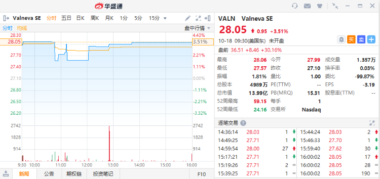 华盛资讯10月18日消息,今日美股盘前,Valneva(VALN)盘前暴涨超30%,旗下在研新冠疫苗3期试验取得积极结果。