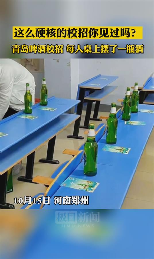 近日,有网友发布视频称,10月15日,青岛啤酒在河南省郑州市一高校进行2022年校园招聘,教室里每个座位前都放置了一瓶青岛啤酒。教室的后墙上还悬挂有“青岛啤酒2022年校园招聘”字样的横幅。视频发布后,引发众多网友关注、评论、转发。有网友调侃:“谁吹瓶最快谁得offer。”还有网友调侃:“不太满意,连个下酒菜都没有。”