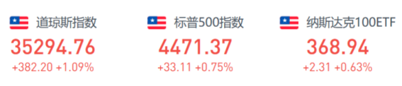 道指涨382.20点,或1.09%,报35294.76点;纳指涨73.91点,或0.50%,报14897.34点;标普500指数涨33.11点,或0.75%,报4471.37点。