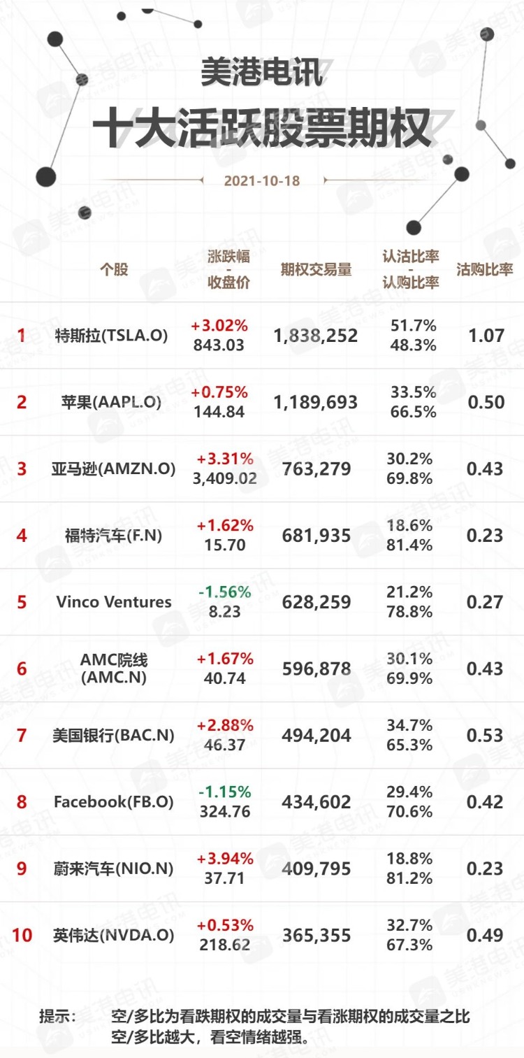 隔夜美股十大活跃股票期权概况一览:特斯拉(TSLA)期权交易量相比上一交易日大幅飙升超100万张,空/多比达1.07。
