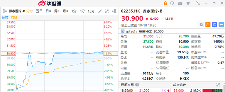华盛资讯10月18日讯,医械器械企业微泰医疗-B(02235.HK)暗盘收涨1.31%,此前低开超5%;成交额1450万港元,总市值超120亿港元。该股预计将于明日(10.19)正式上市。