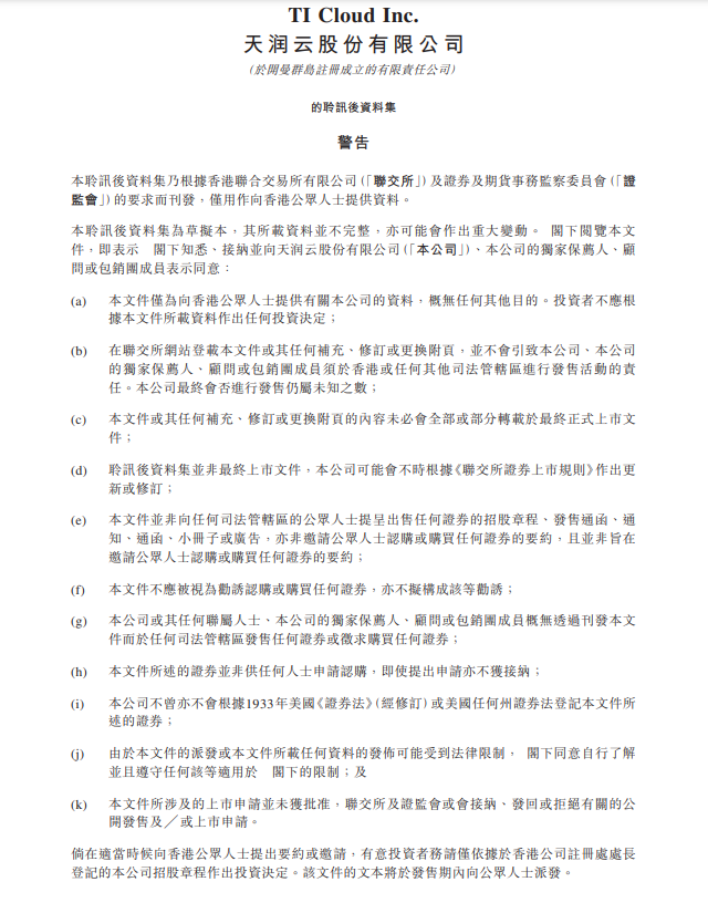 据港交所文件披露,天润云股份有限公司通过港交所上市聆讯。