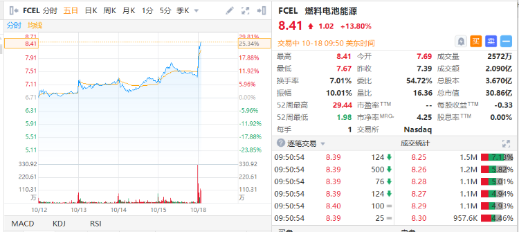 截至发稿,燃料电池能源(FCEL)盘初快速拉升,大涨13.80%。其他氢能源股跟涨,普拉格能源(PLUG)涨3.10%,Bloom Energy(BE)涨1.09%。