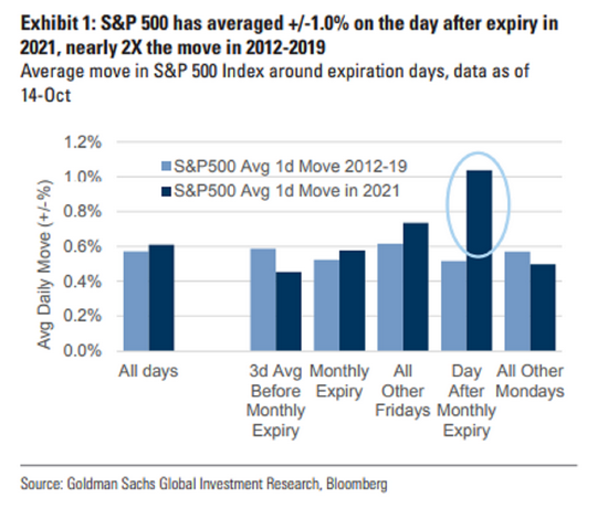 根据高盛的研究,虽然标普500指数今年在到期日的波动率与疫情前的水平一致,但在月度期权到期后首日交易的波动更大,指数平均波动1%,几乎是2012-2019年期间的两倍。